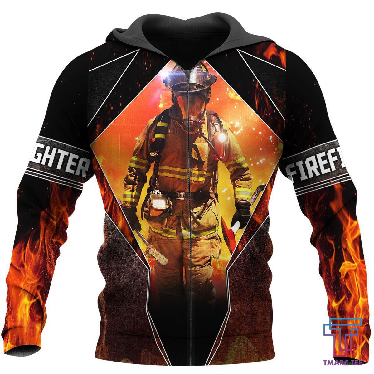 Bold firefighter graphics: Helmets, axes, flames, or patriotic designs that stand out