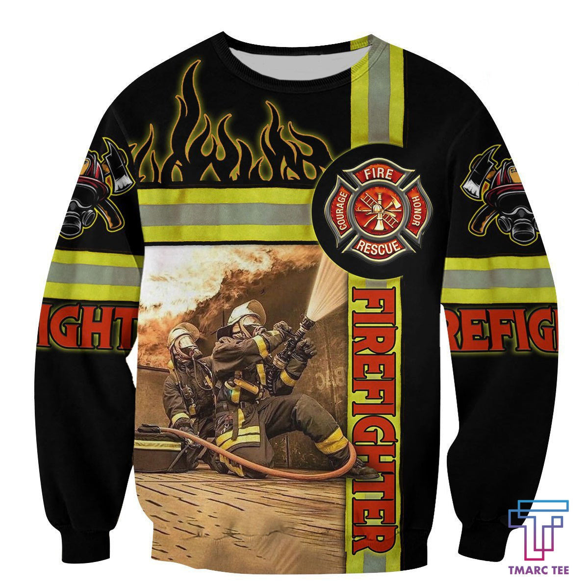 Bold firefighter graphics: Helmets, axes, flames, or patriotic designs that stand out