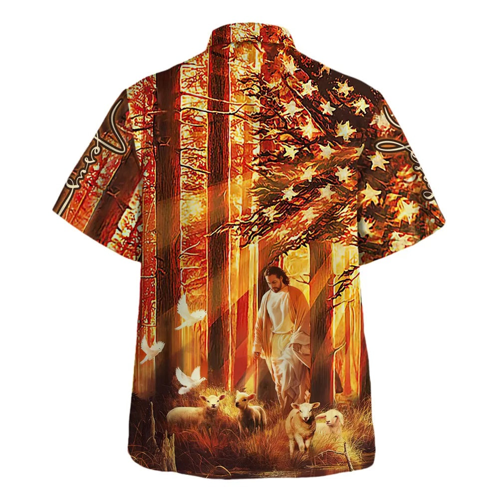 UniJames Jesus Walking In The Forest With The Sheep Hawaiian Shirt - Christian Hawaiian Shirt - Religious Hawaiian Shirts