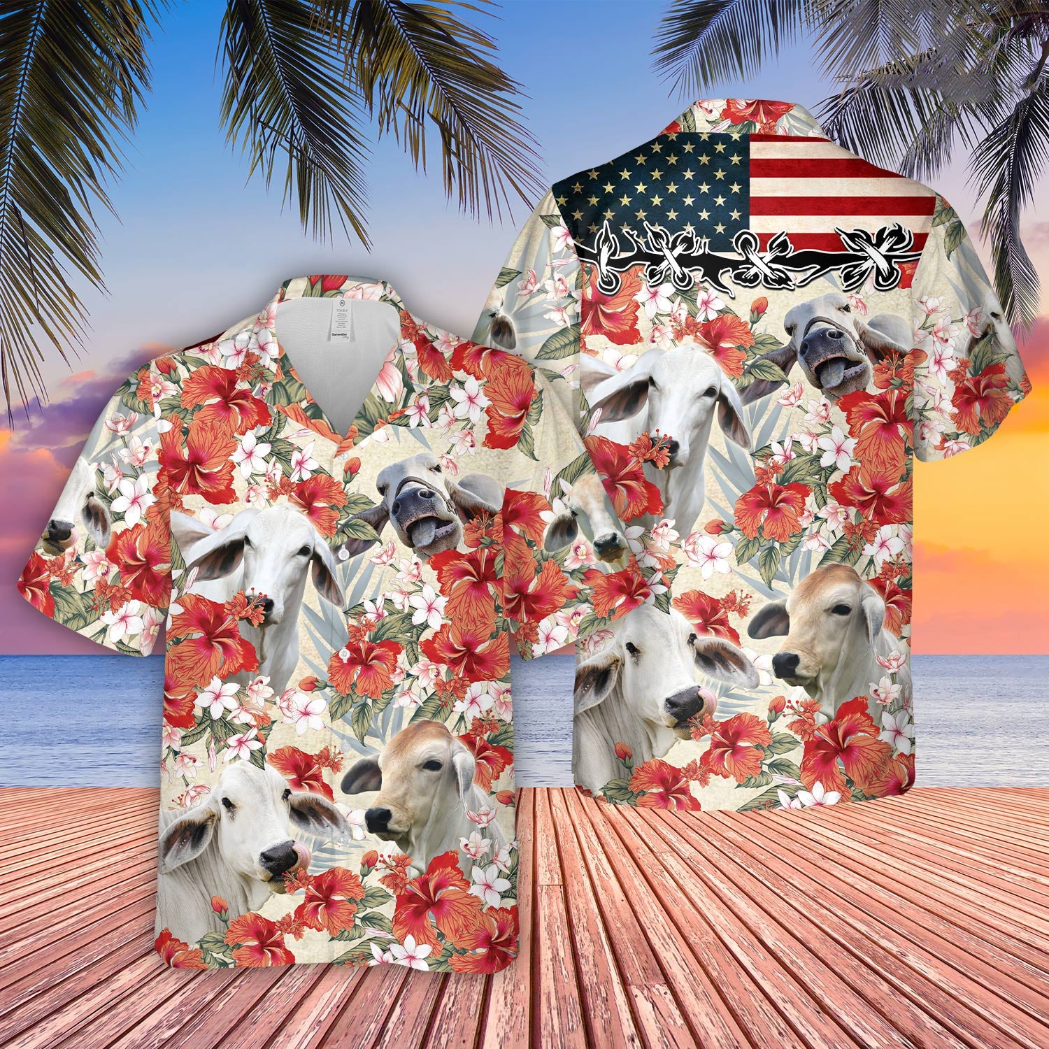 Uni Brahman Hibicus Floral US Flag 3D Hawaiian Shirt