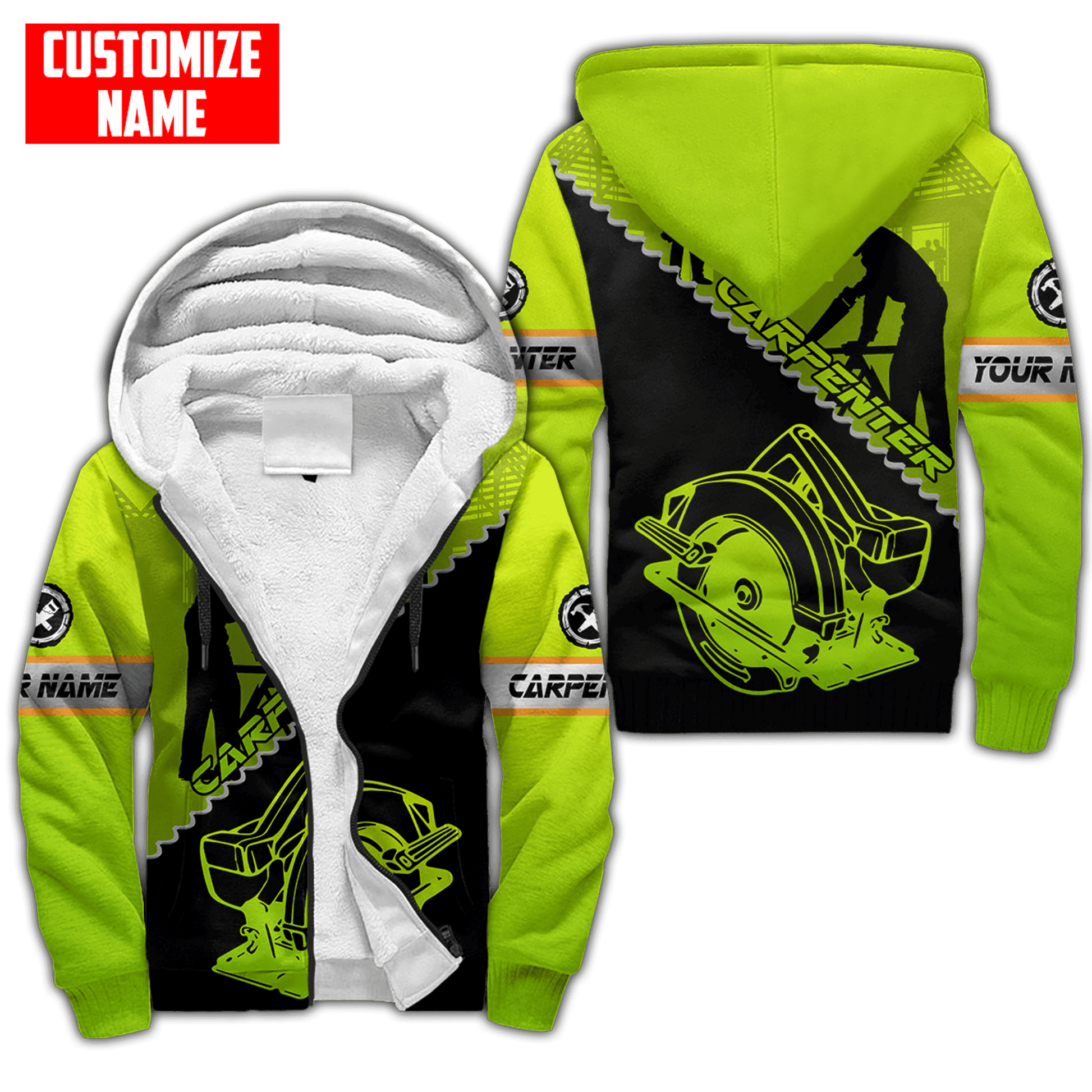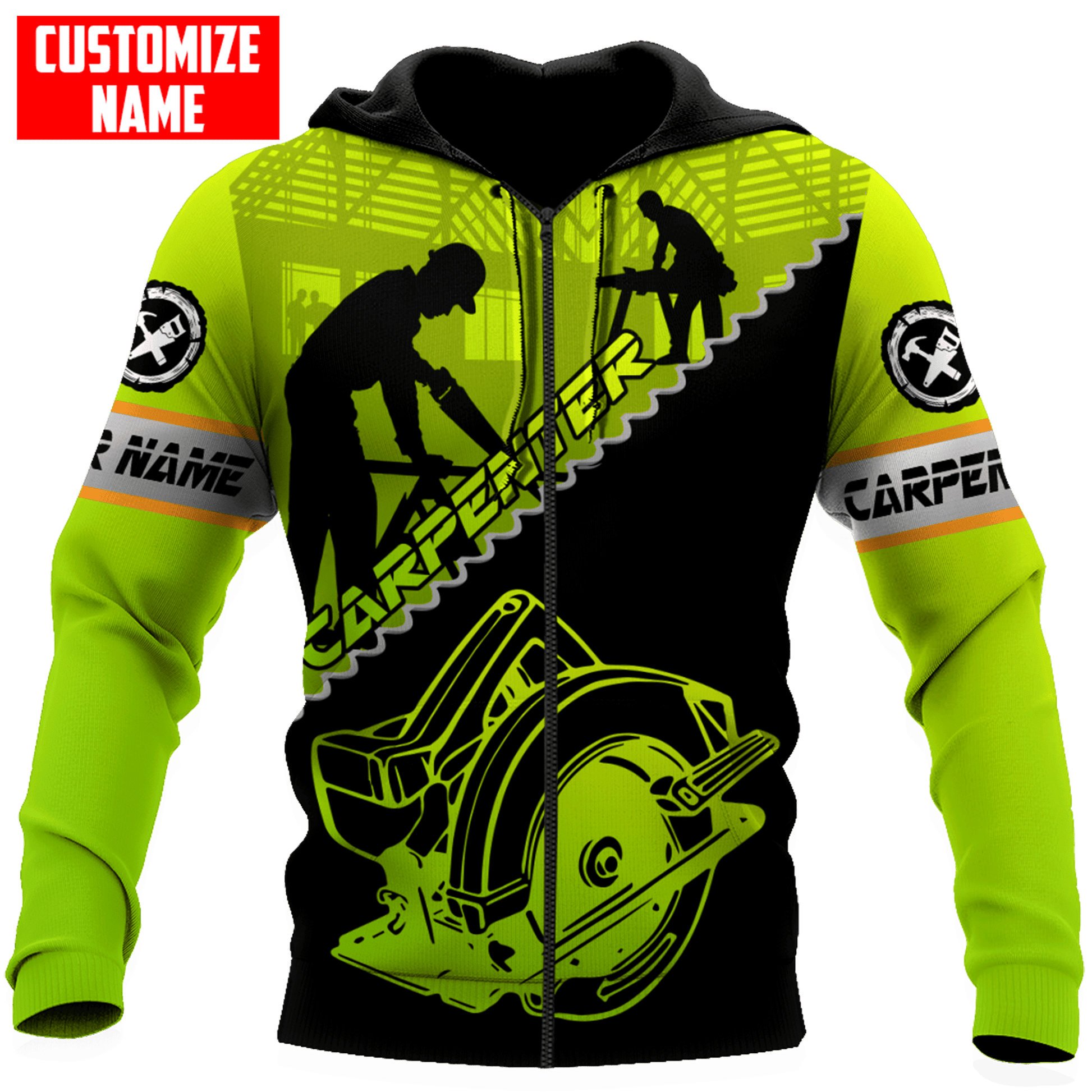 Bold carpenter-themed graphics: Hammers, saws, woodgrain textures, tool belts, and more