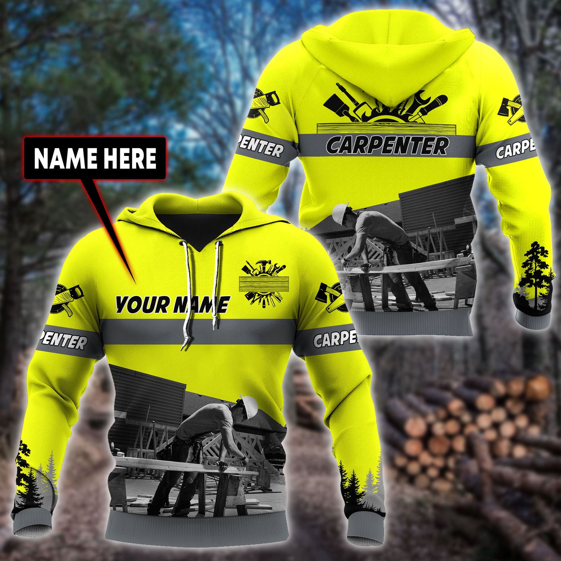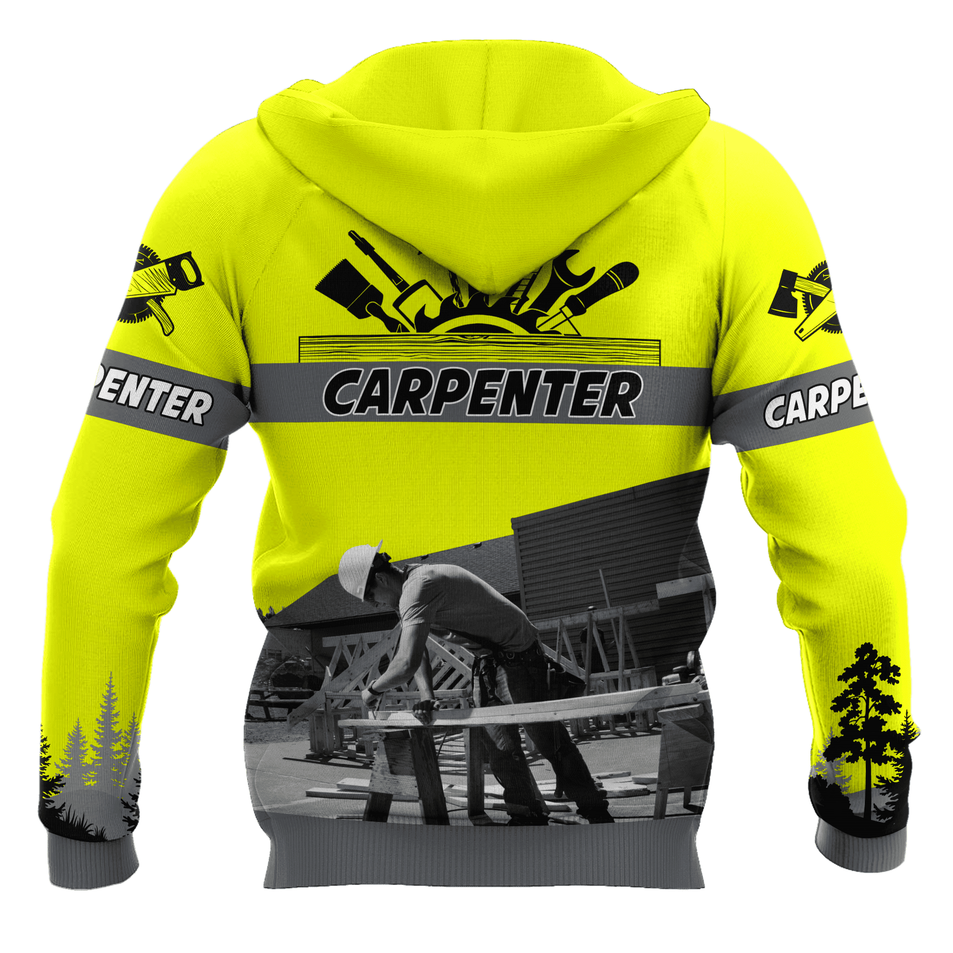 Bold carpenter-themed graphics: Hammers, saws, woodgrain textures, tool belts, and more