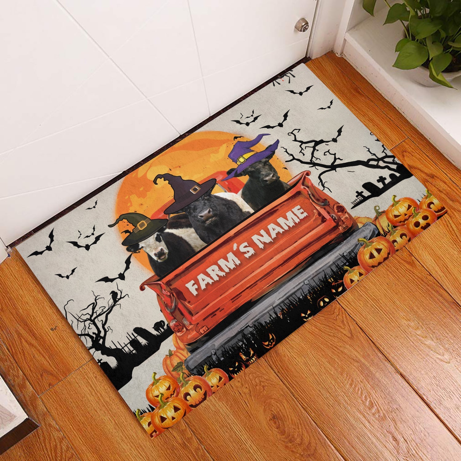 Uni Belted Galloway Custom Farm Name Halloween Doormat