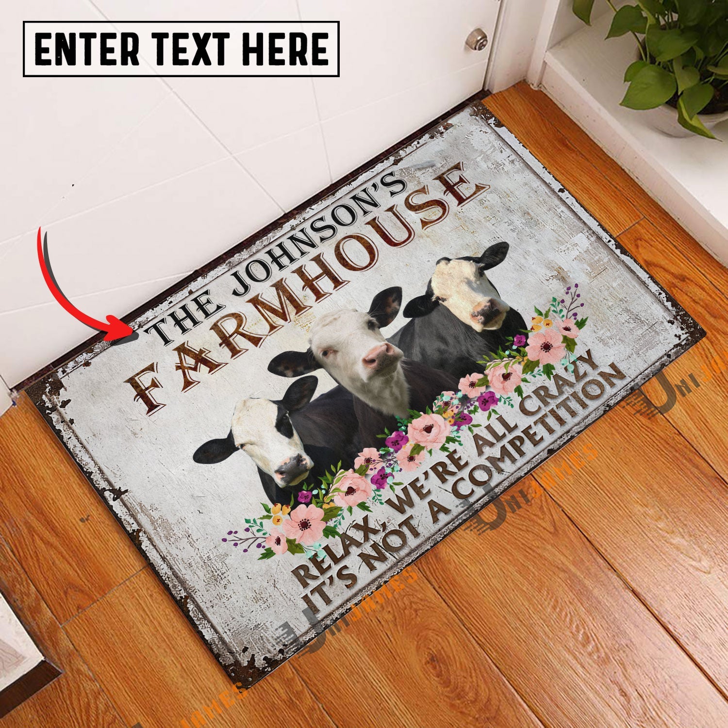 Uni Black Baldy Relax Cattle Farm Personalized Name Doormat