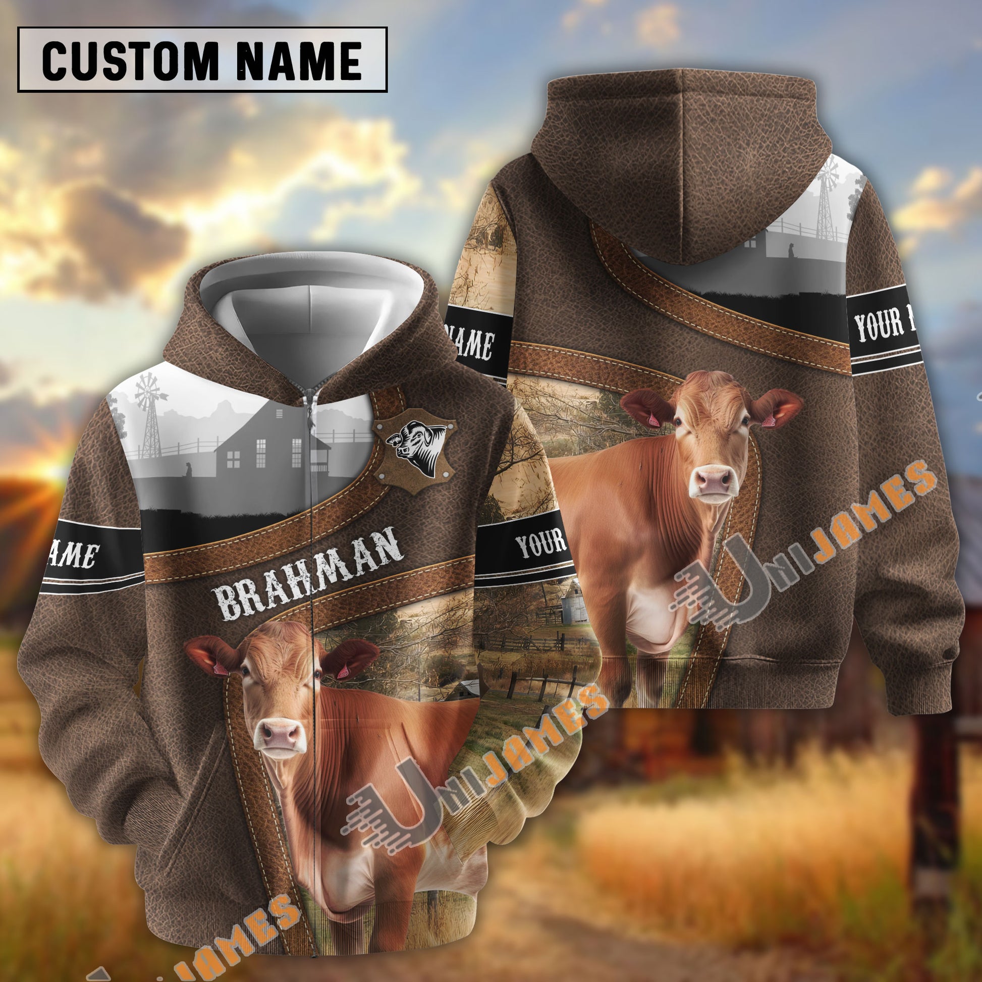 Uni Brahman Light Leather Pattern Personalized Name and Farm Name Color Mixed 3D Hoodie