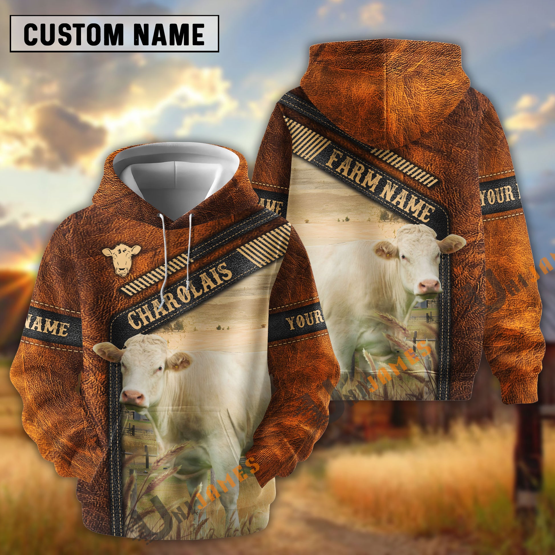 Uni Charolais Dark Leather Pattern Personalized Name and Farm Name Color Mixed 3D Hoodie