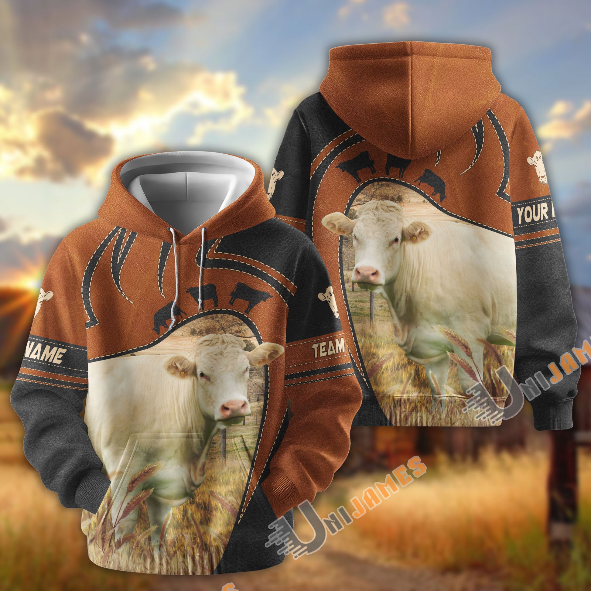 Uni Charolais Leather Pattern Custom Name, Farm Name 3D Hoodie