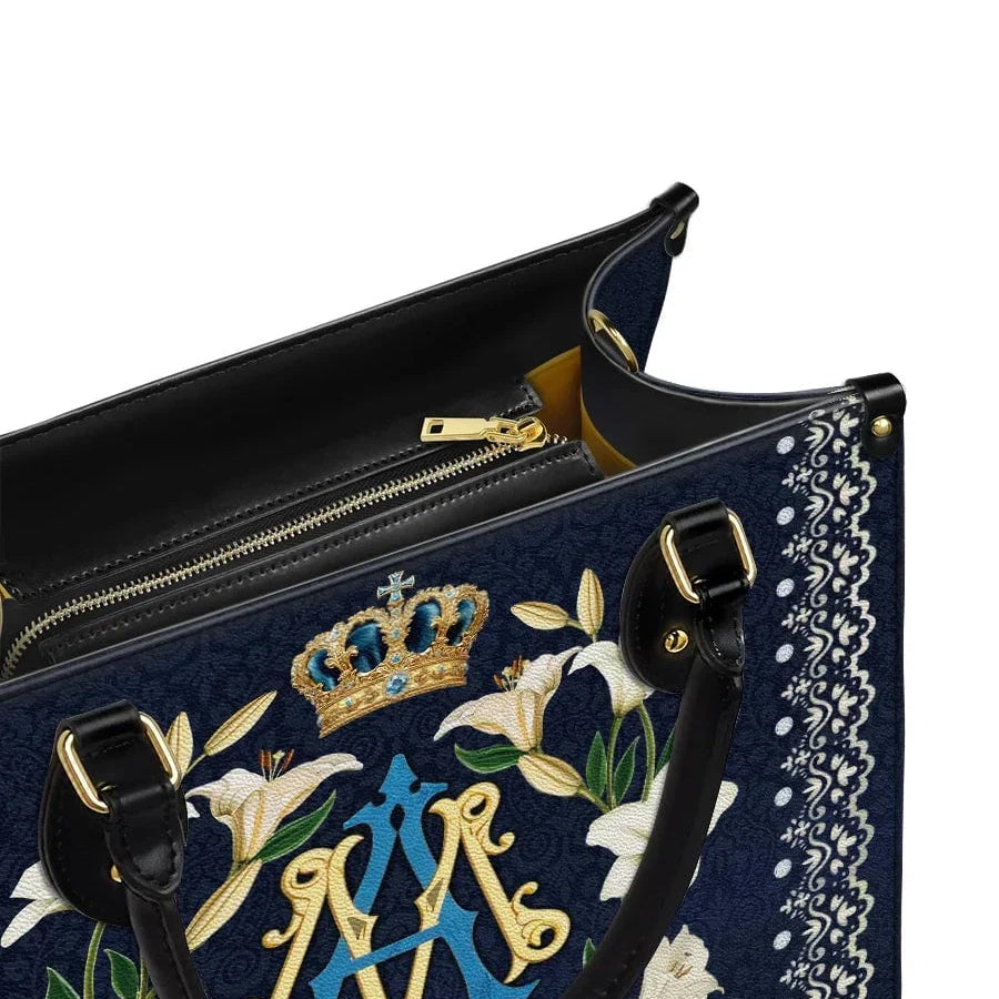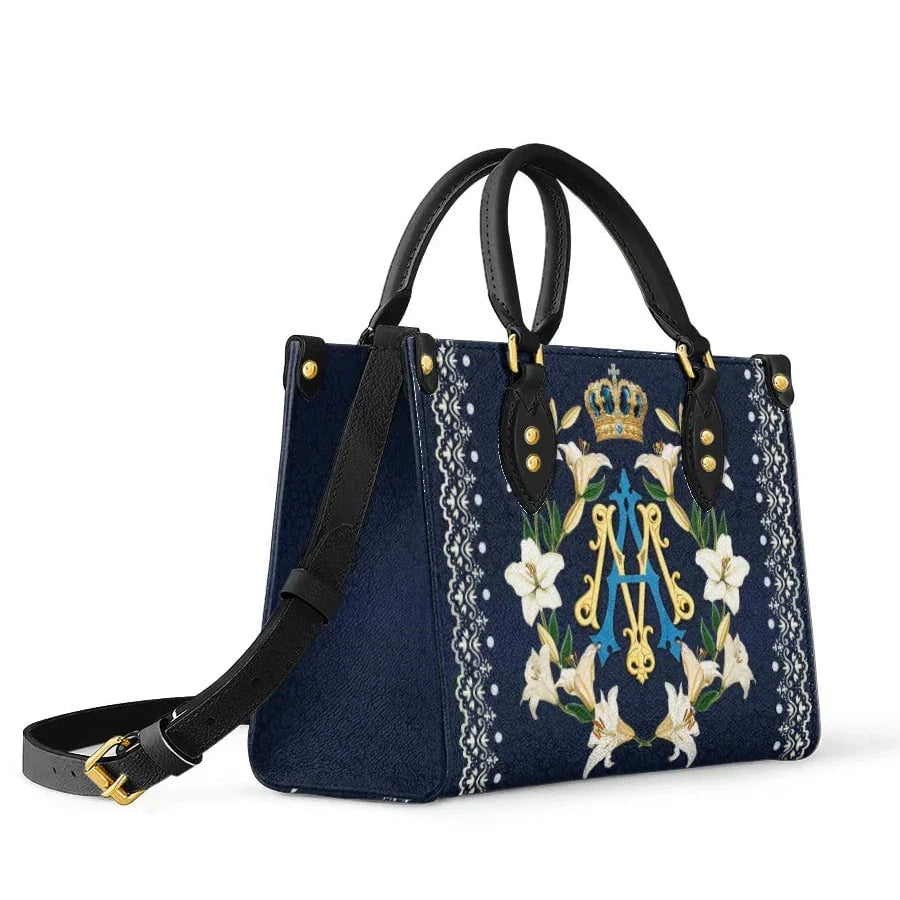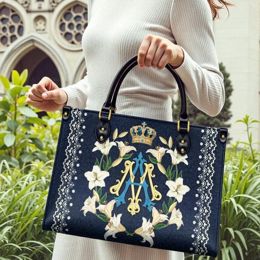 Carrying this bag brings a sense of spiritual connection and grace, a daily expression of devotion to Mary and her virtues. The intricate details of the design, from the regal monogram to the blooming lilies, create a visual masterpiece that resonates deeply with the heart.