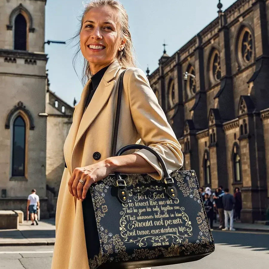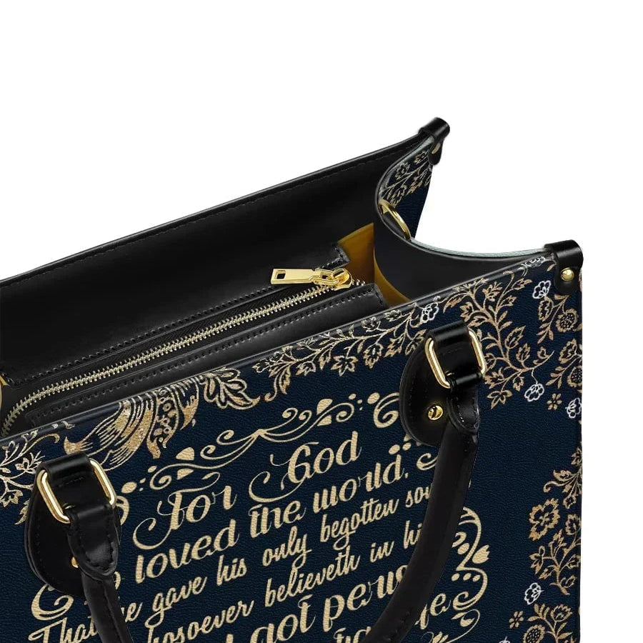 This elegant leatherbag features a profound and timeless display of the scripture from John 3:16, beautifully rendered in golden lettering against a deep navy background. The verse, "For God so loved the world, that He gave His only begotten Son, that whosoever believeth in Him should not perish, but have everlasting life," is framed with ornate floral and scrollwork patterns, evoking a sense of divine beauty and reverence.