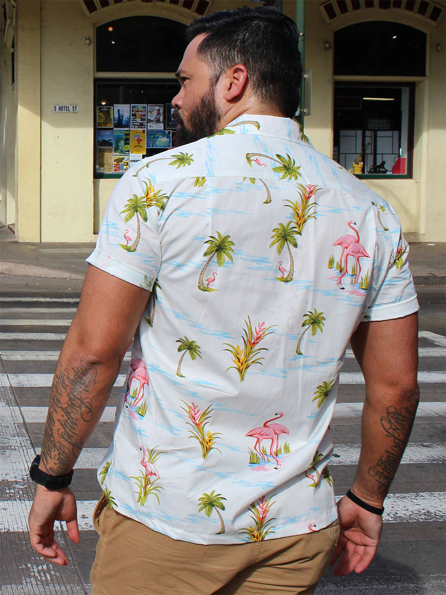 Uni Ferocious Flamingo White Hawaiian Shirt Aloha Shirt Short Sleeve Shirt Vacation Hawaiian Outdoor Vacation Hawaiian Shirt