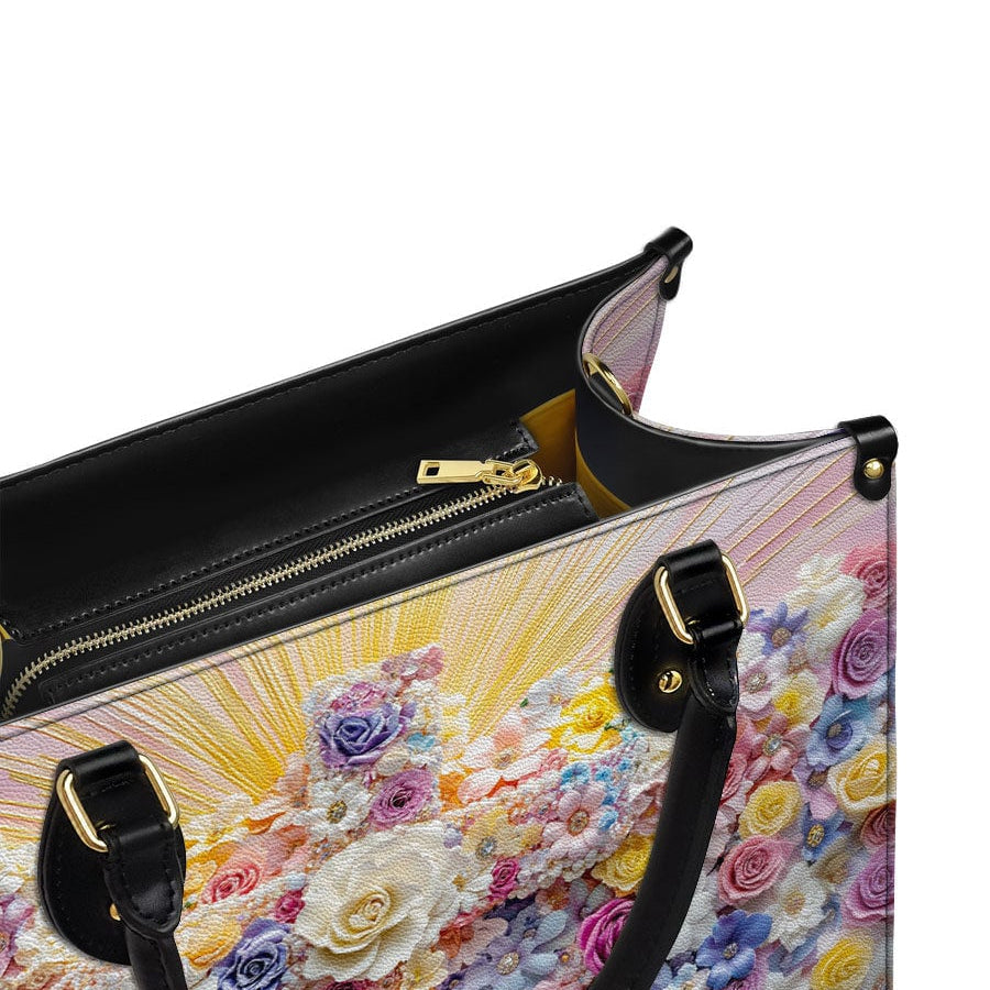 This vibrant leather bag features a stunning cross made entirely of colorful blooming flowers, symbolizing the beauty of resurrection, renewal, and divine love. Radiant golden light emanates from behind the cross, highlighting its sacred significance and creating a sense of hope and spiritual upliftment. The pastel hues of pink, blue, yellow, and white flowers reflect joy, grace, and faith, making this design a celebration of life and faith.