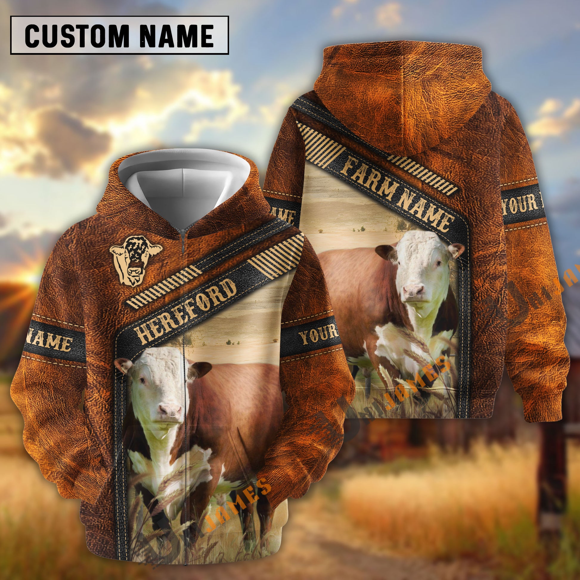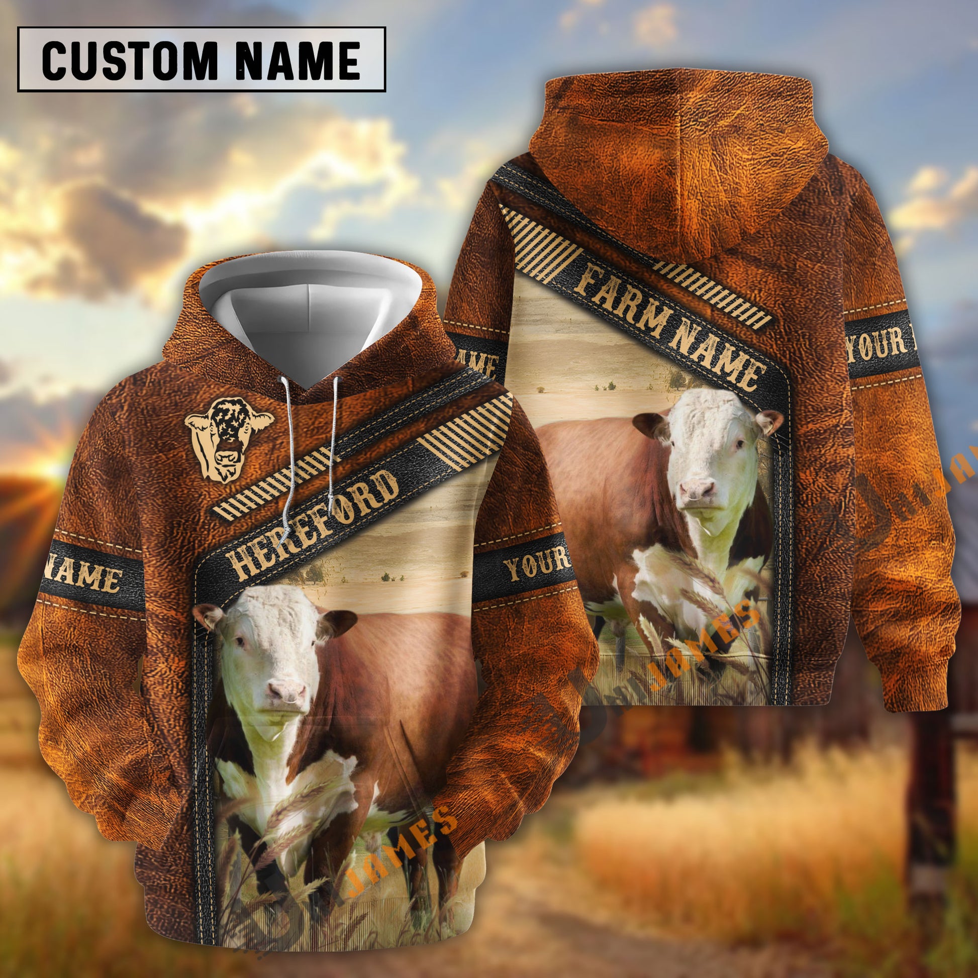 Uni Hereford Dark Leather Pattern Personalized Name and Farm Name Color Mixed 3D Hoodie