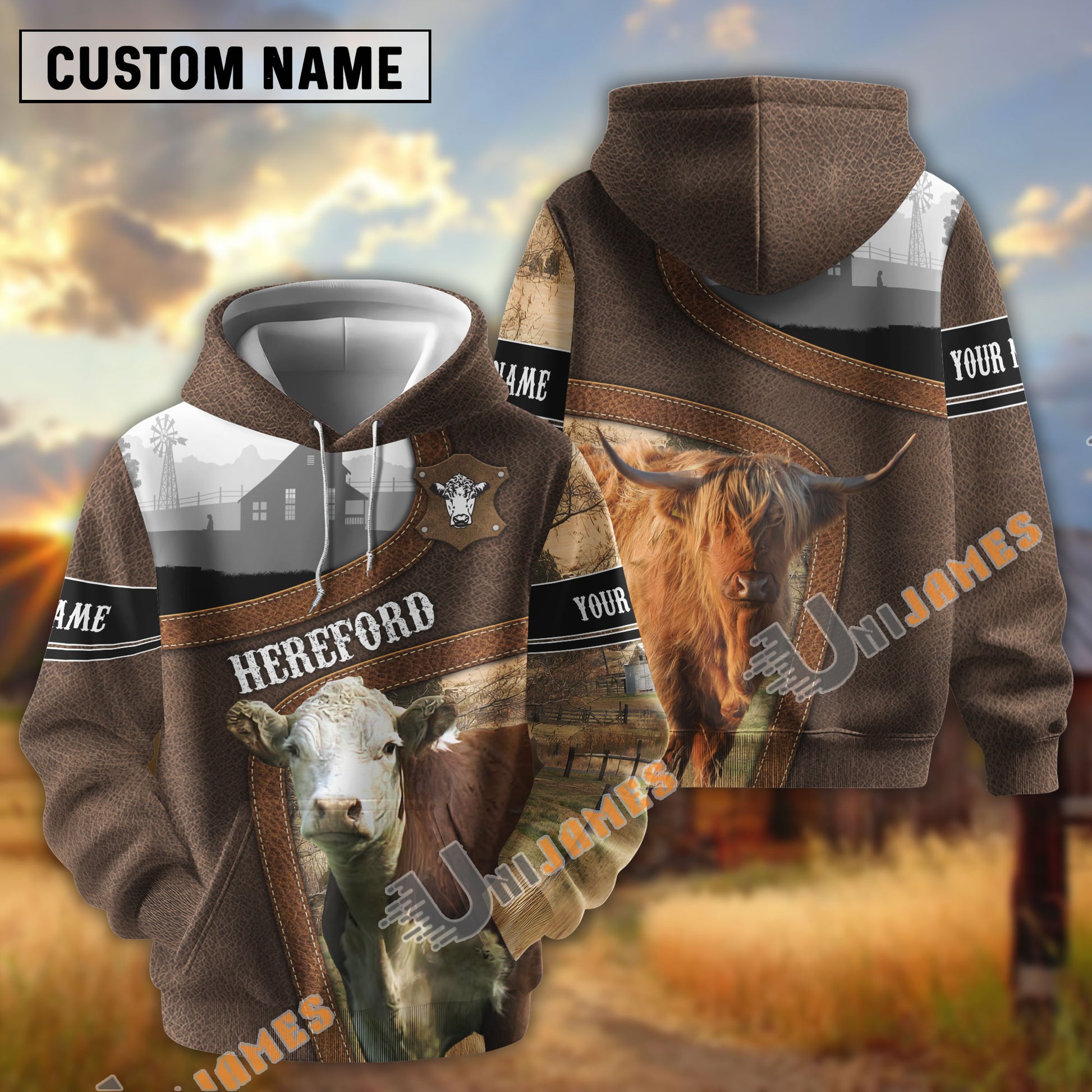 Uni Hereford Light Leather Pattern Personalized Name and Farm Name Color Mixed 3D Hoodie