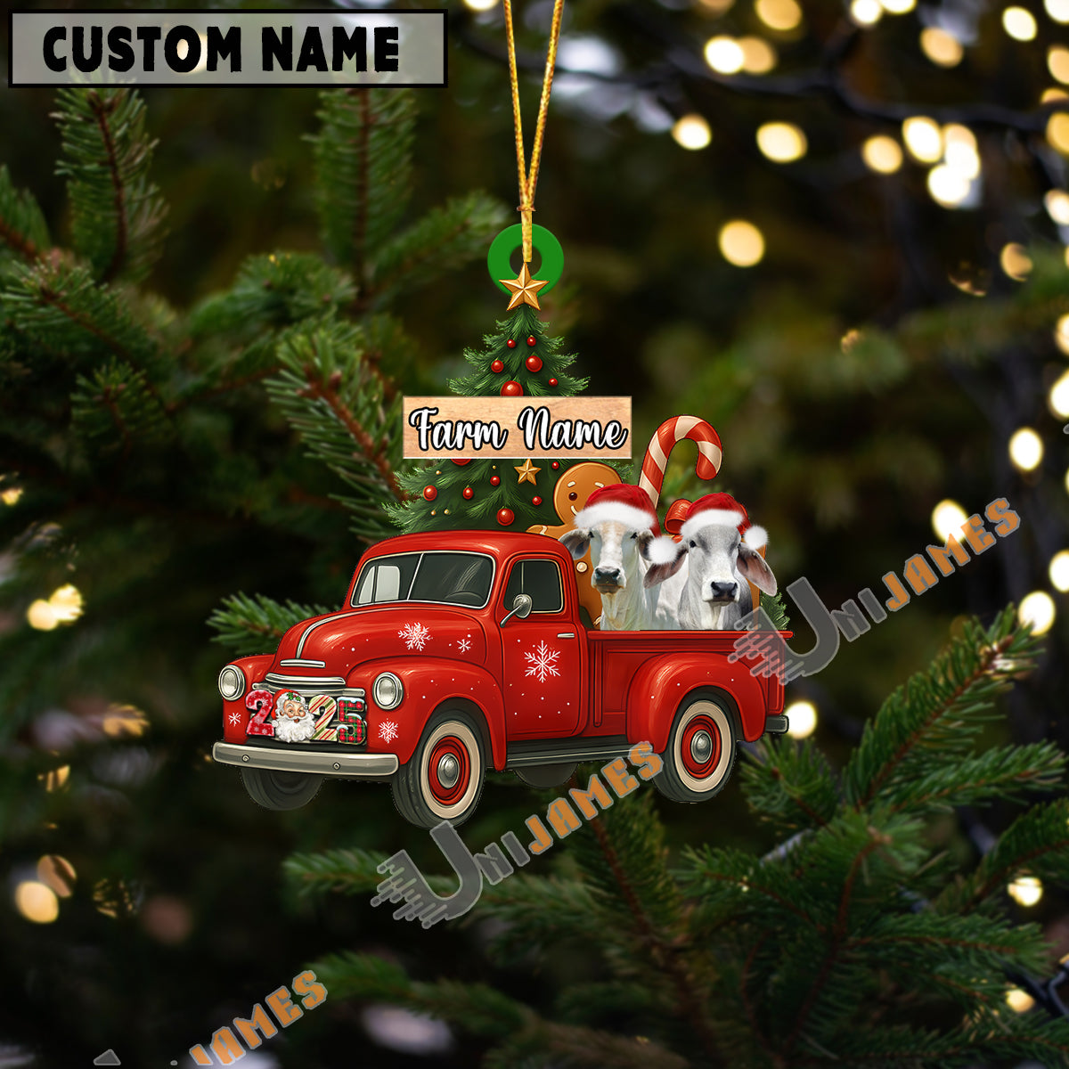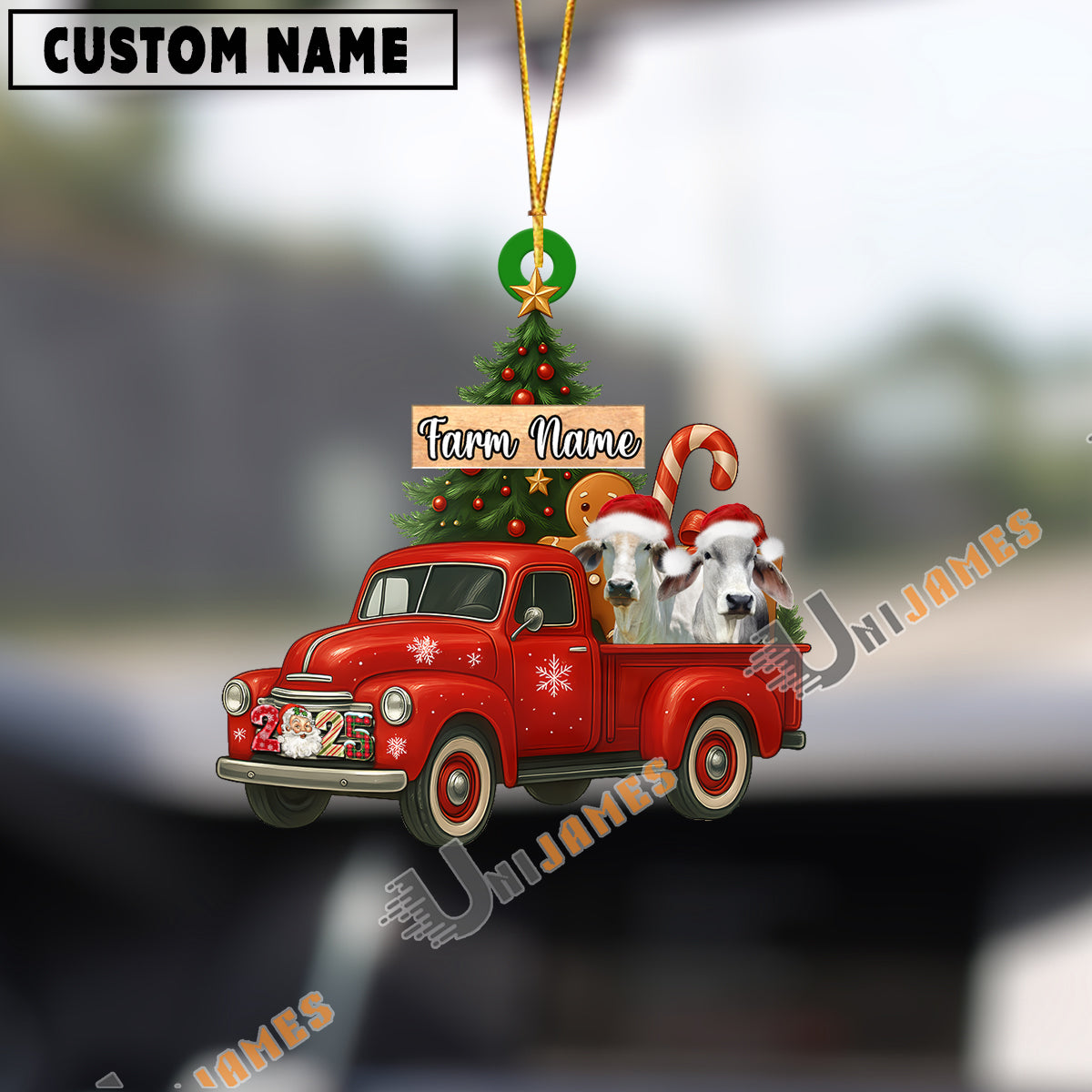 Uni Personalized Brahman Ornament – Red Christmas Truck & Farm Name Custom Shape Acrylic Ornament