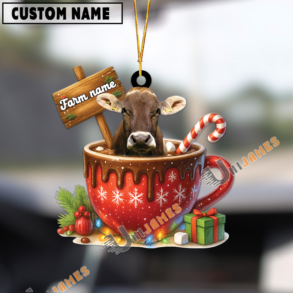 Uni Personalized Brown Swiss Moo-ry Christmas Cocoa Mug Acrylic Ornament