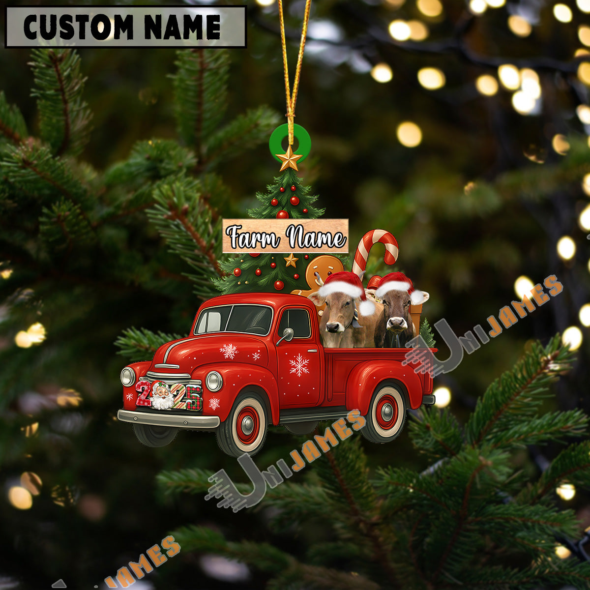 Uni Personalized Brown Swiss Ornament – Red Christmas Truck & Farm Name Custom Shape Acrylic Ornament