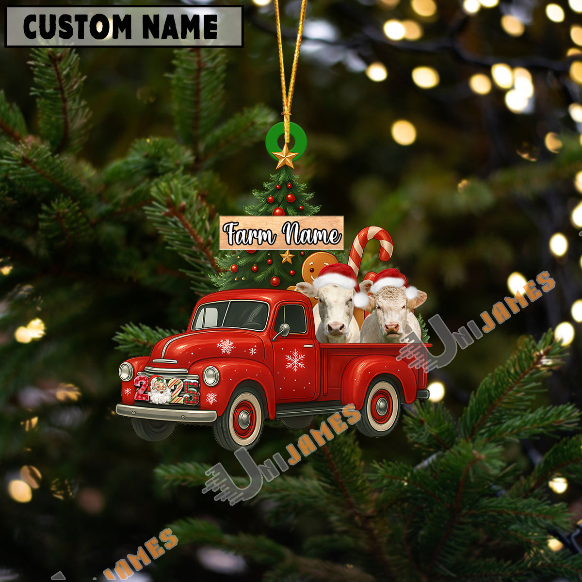 Uni Personalized Charolais Ornament – Red Christmas Truck & Farm Name Custom Shape Acrylic Ornament