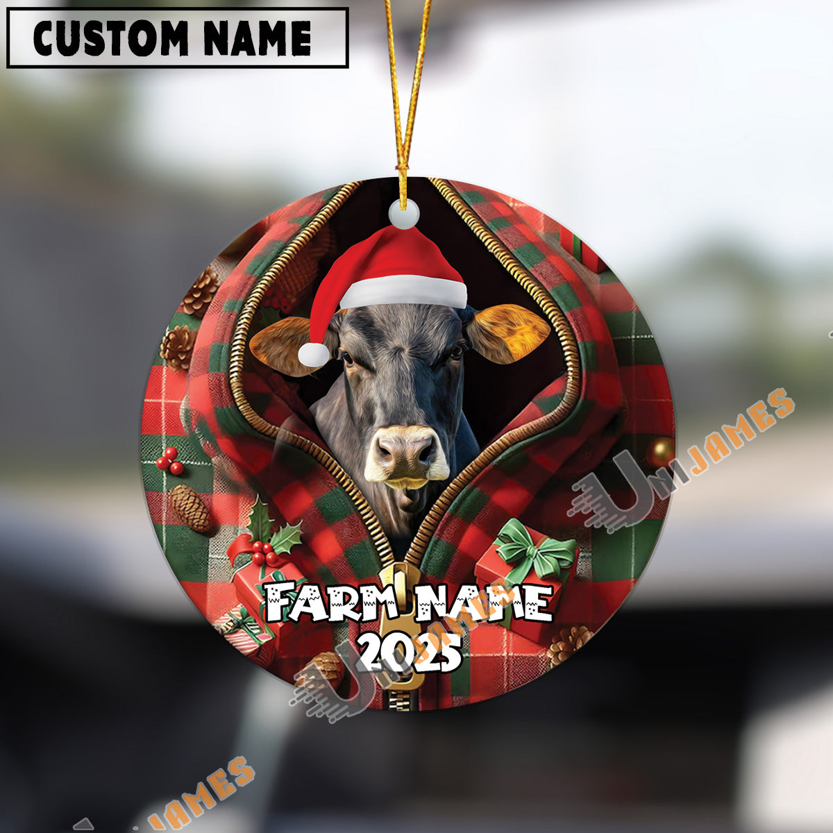 Uni Personalized Farm Name Merry Brown Swiss Farm Plaid Ornament
