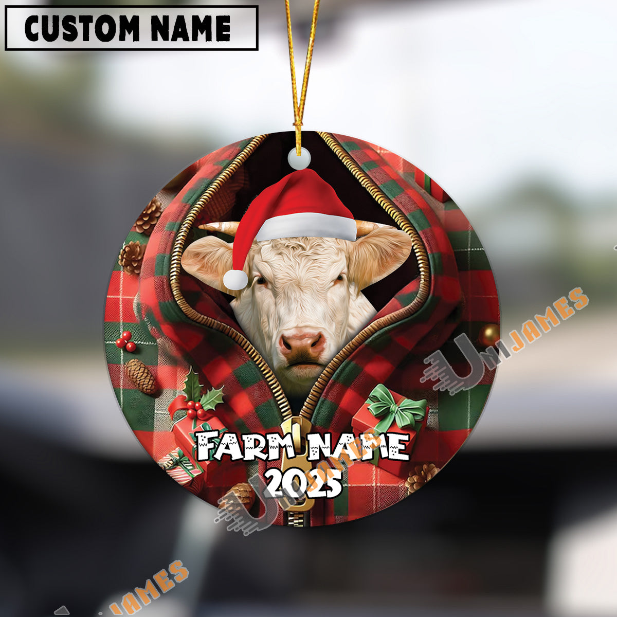 Uni Personalized Farm Name Merry Charolais Farm Plaid Ornament