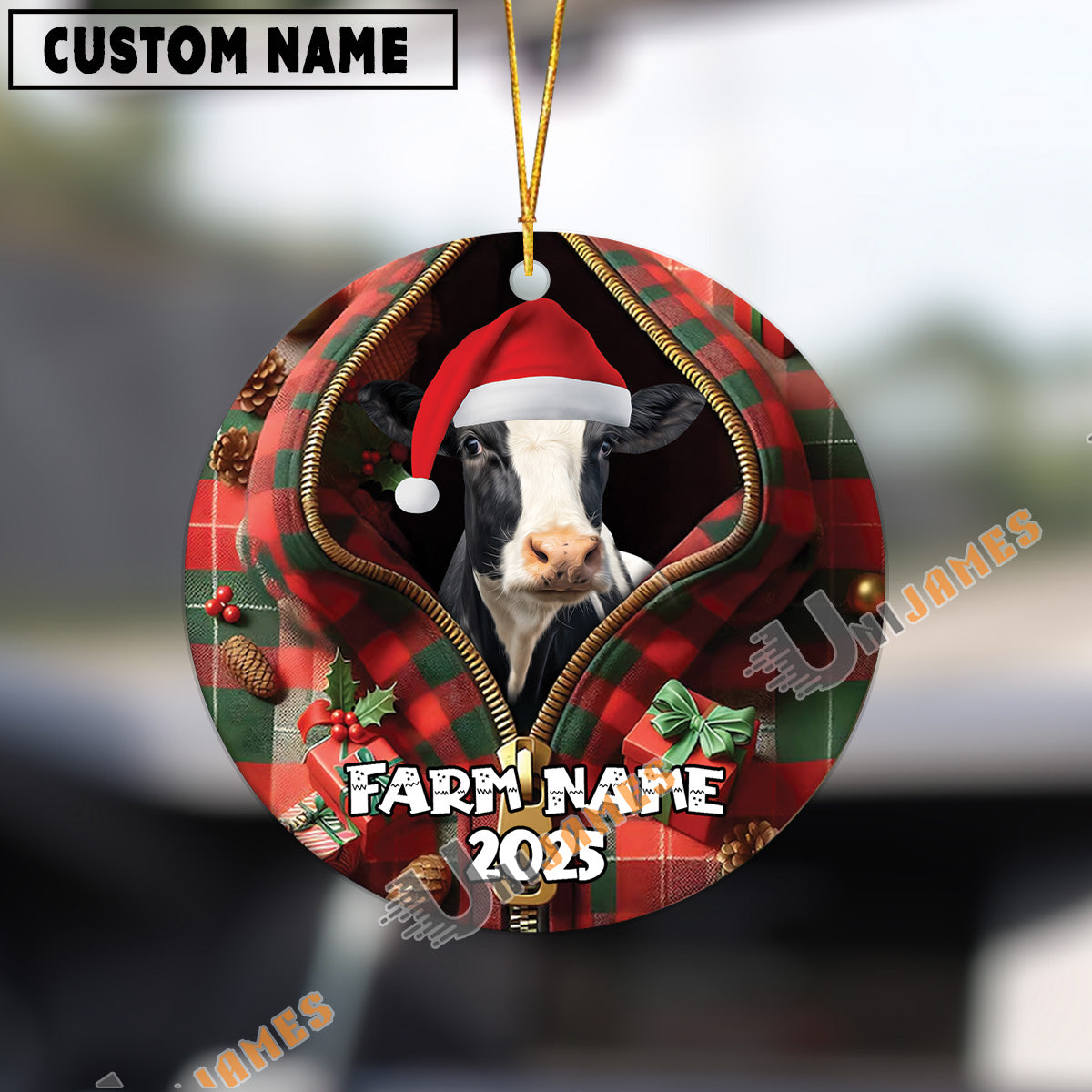 Uni Personalized Farm Name Merry Holstein Farm Plaid Ornament