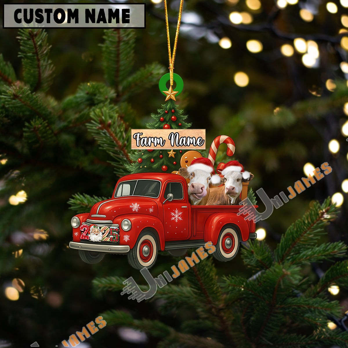 Uni Personalized Simmental Ornament – Red Christmas Truck & Farm Name Custom Shape Acrylic Ornament
