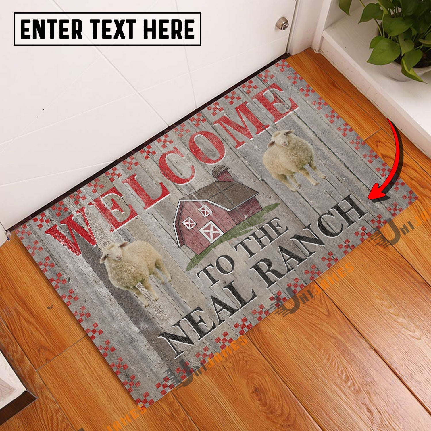 Uni Sheep Welcome To The Farmhouse Custom Name Doormat