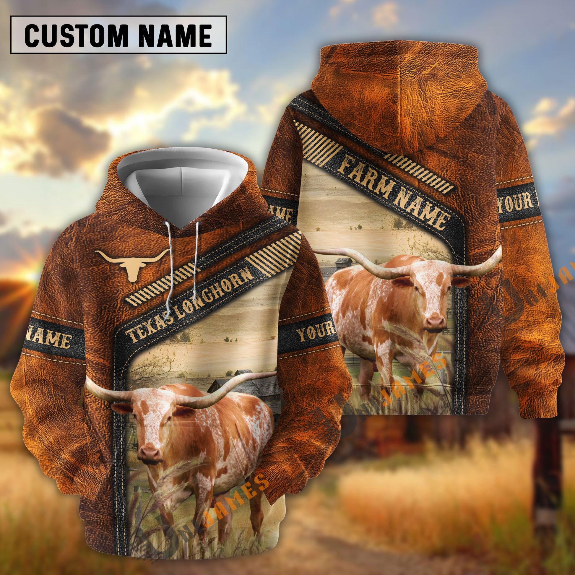 Uni Texas Longhorn Dark Leather Pattern Personalized Name and Farm Name Color Mixed 3D Hoodie