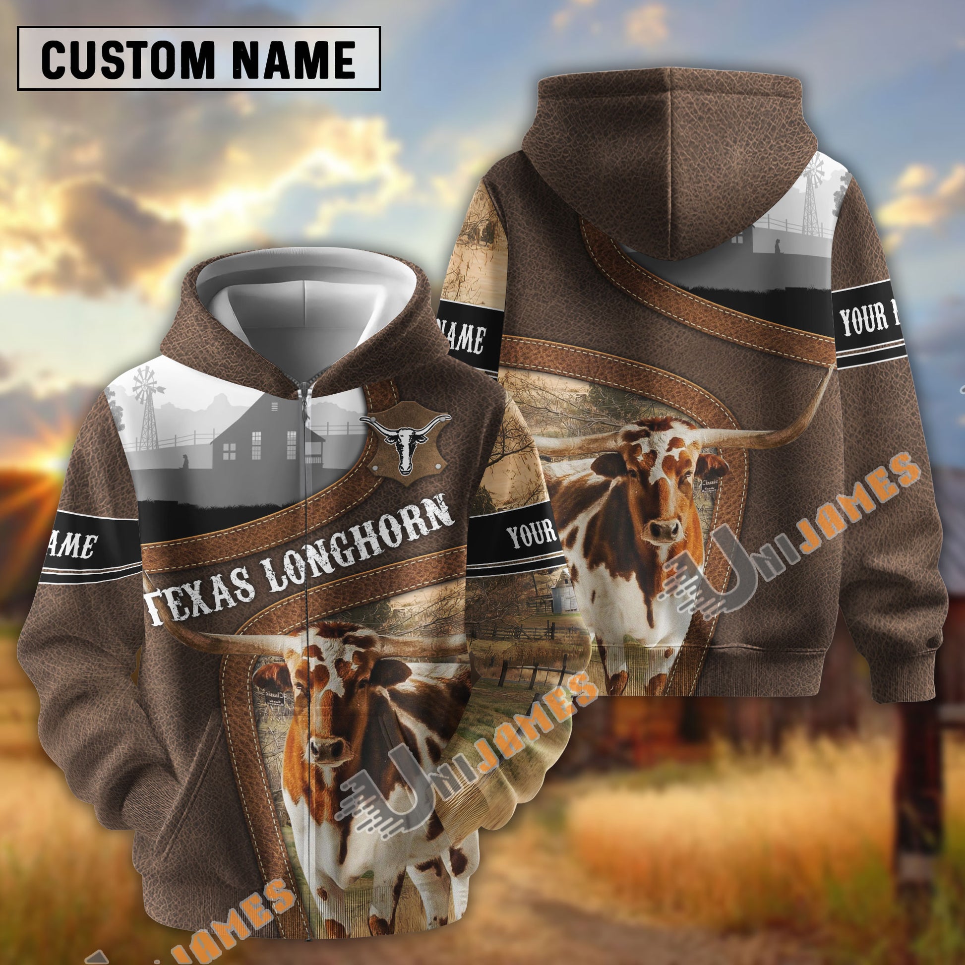 Uni Texas Longhorn Light Leather Pattern Personalized Name and Farm Name Color Mixed 3D Hoodie