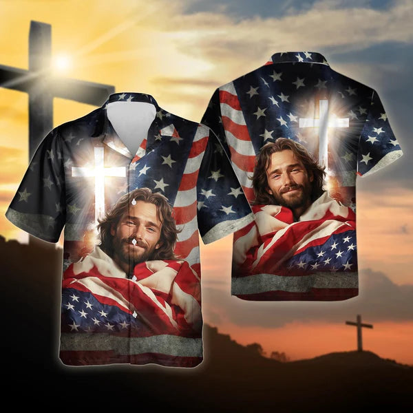 UniJames Jesus Smile With America Flag Christian Hawaiian Shirt - Hawaiian Beach Shirts for Men Women
