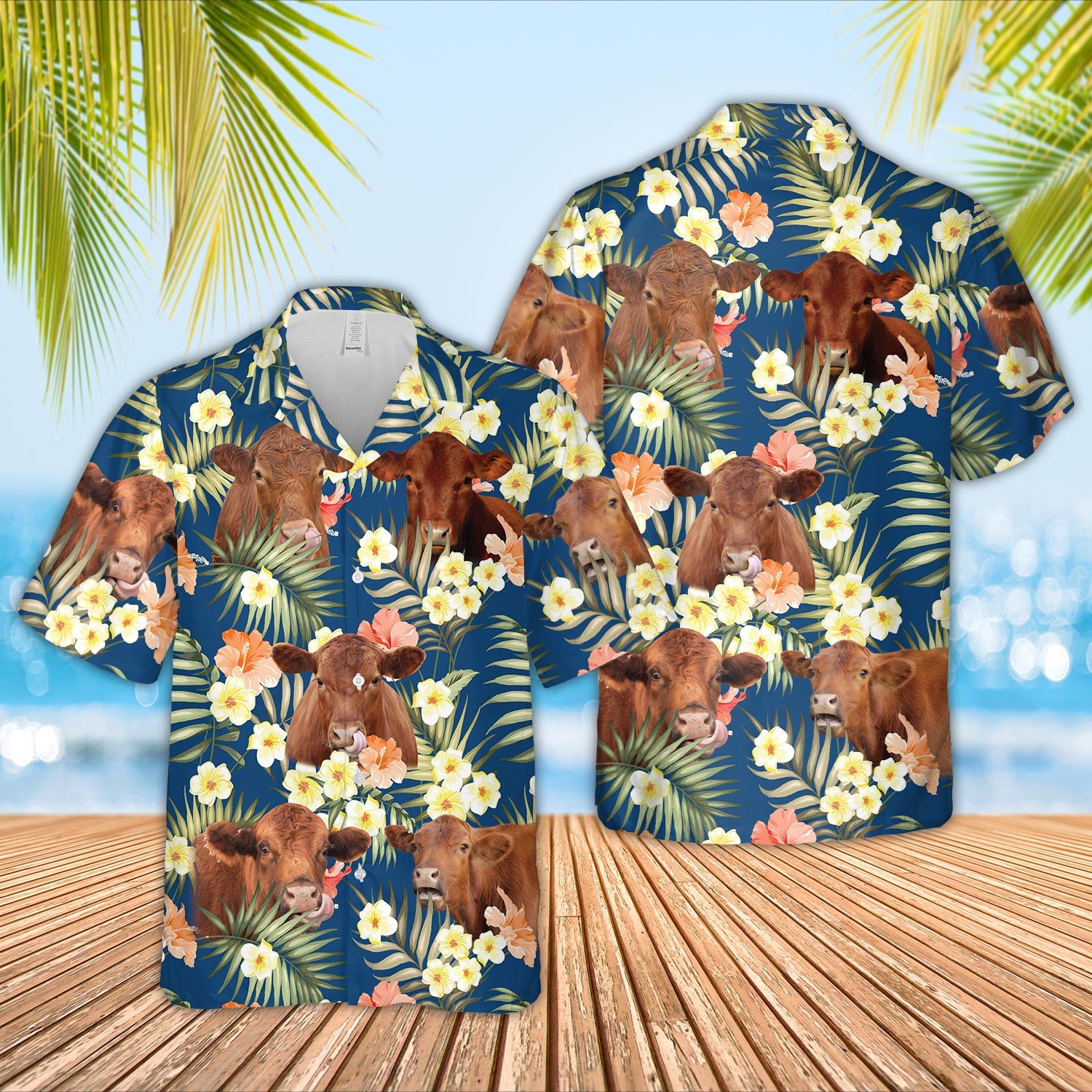 Unique Red Angus Summer Blue Floral 3D Hawaiian Shirt