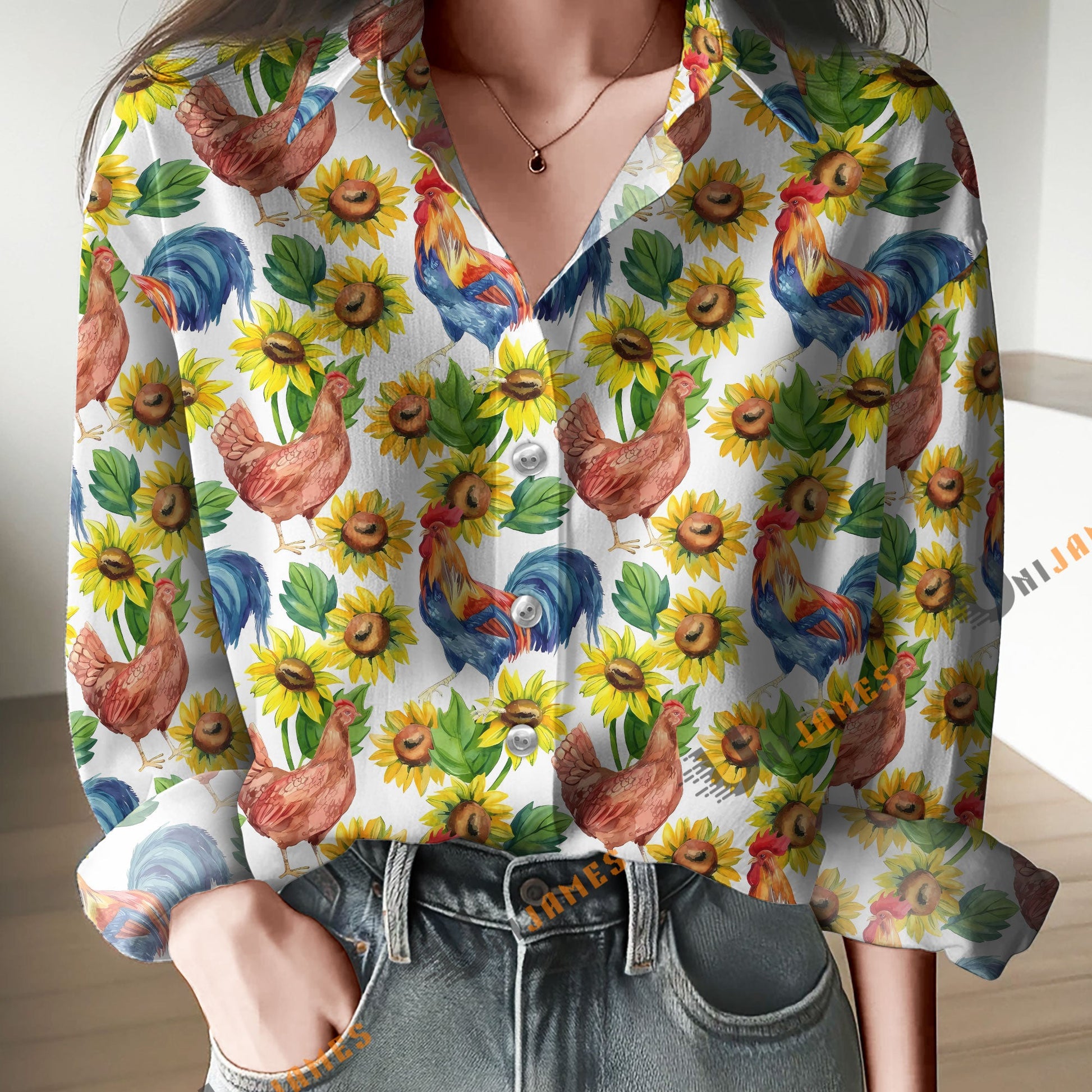 Unique Watercolor Chicken & Rooster Sunflower Casual Shirt